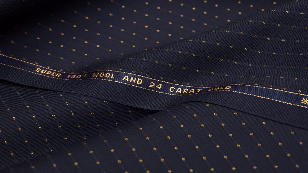 These luxurious suiting fabrics are made of Super 150’s worsted wool interwoven with platinum and 24-carat gold threads. Available in dark blue, anthracite and black, they come in a classic stripe design and have a glimmering sheen.