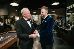 Defined as a matching base fabric such as black or navy wool with a contrasting fabric in satin for a high luster or grosgrain for a matte finish. The contrasting fabric of a tuxedo is typically placed on the jacket’s lapels, exterior pocket piping, and covers the jacket buttons.