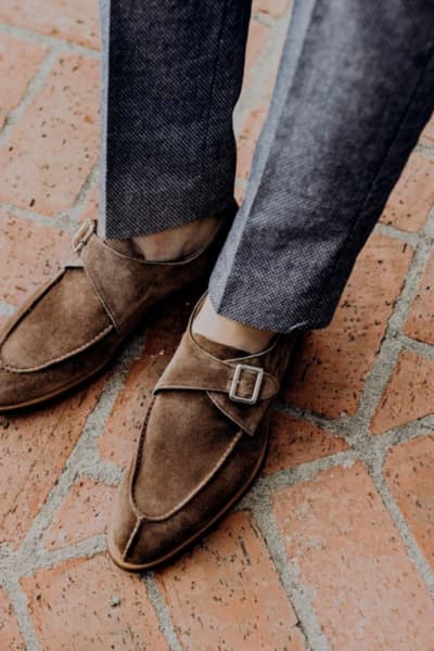 When it comes to shoes, we recommend sticking to two types of material, leather or suede. Look for shoes in tones of browns, tan, olive, greens, burgundy, and gray. Avoid wearing black as the color black is reserved for formal occasions.